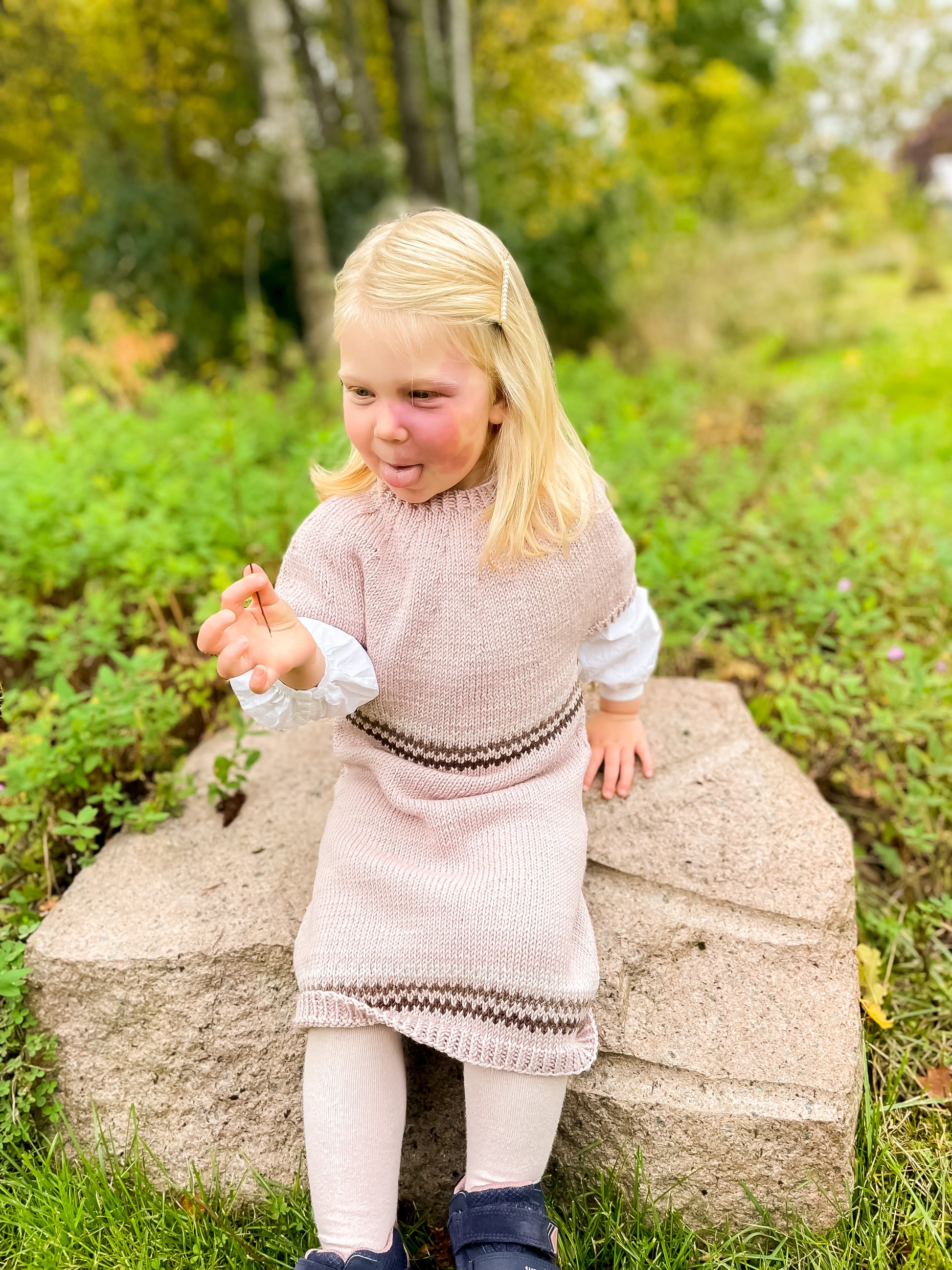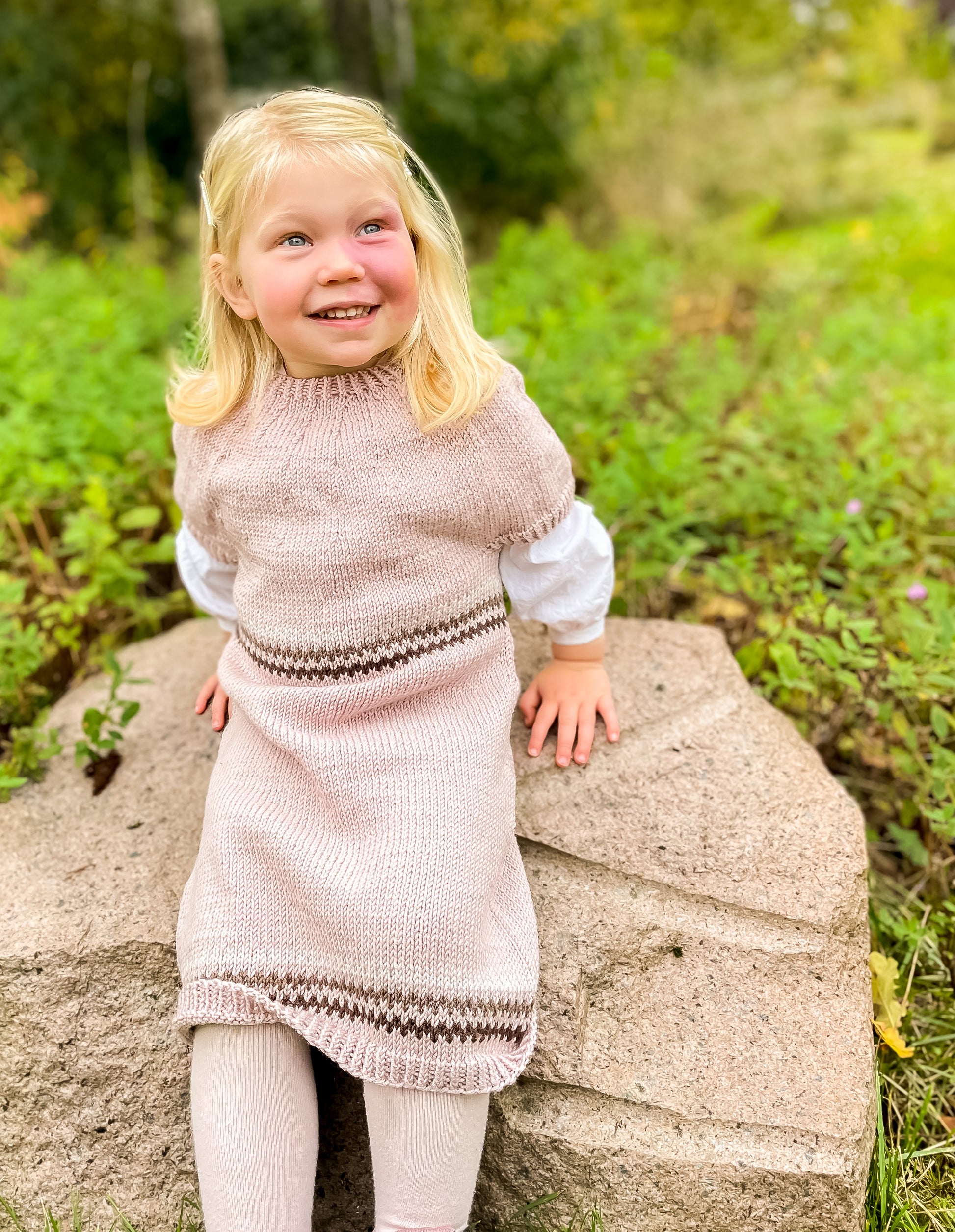 Hermine kjole mini er en deilig og lettstrikket kjole for de aller minste. Kjolen strikkes nedenfra og opp, og består av et enkelt mønster bestående av 3 border som gjentas 2 ganger. Kjolen eksisterer i størrelsene 12/18 mnd. til 11/12 år. Ett perfekt plagg for de minste. Kjolen er lettstrikket, og funker helt fint som ett prosjekt for en nybegynner.