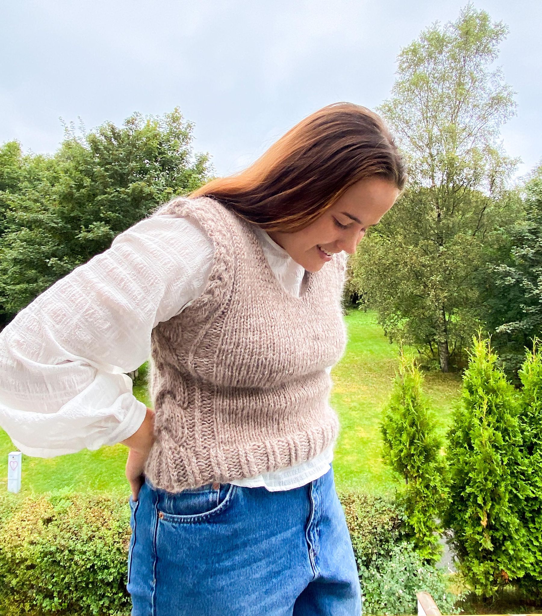 Weekdayvesten er en enkel og stilfull vest, perfekt for både hverdagsbruk og som et ekstra lag på kjølige dager. Strikket med en tråd Drops Nepal og en tråd Drops Kid-Silk, gir denne vesten både varme og en myk, luksuriøs følelse. Designet inkluderer flotte fletter under og rundt ermene, som tilfører et delikat og moderne uttrykk. Vesten strikkes nedenfra og opp, og med sin enkle konstruksjon er den et ideelt prosjekt for alle nivåer av strikkere.